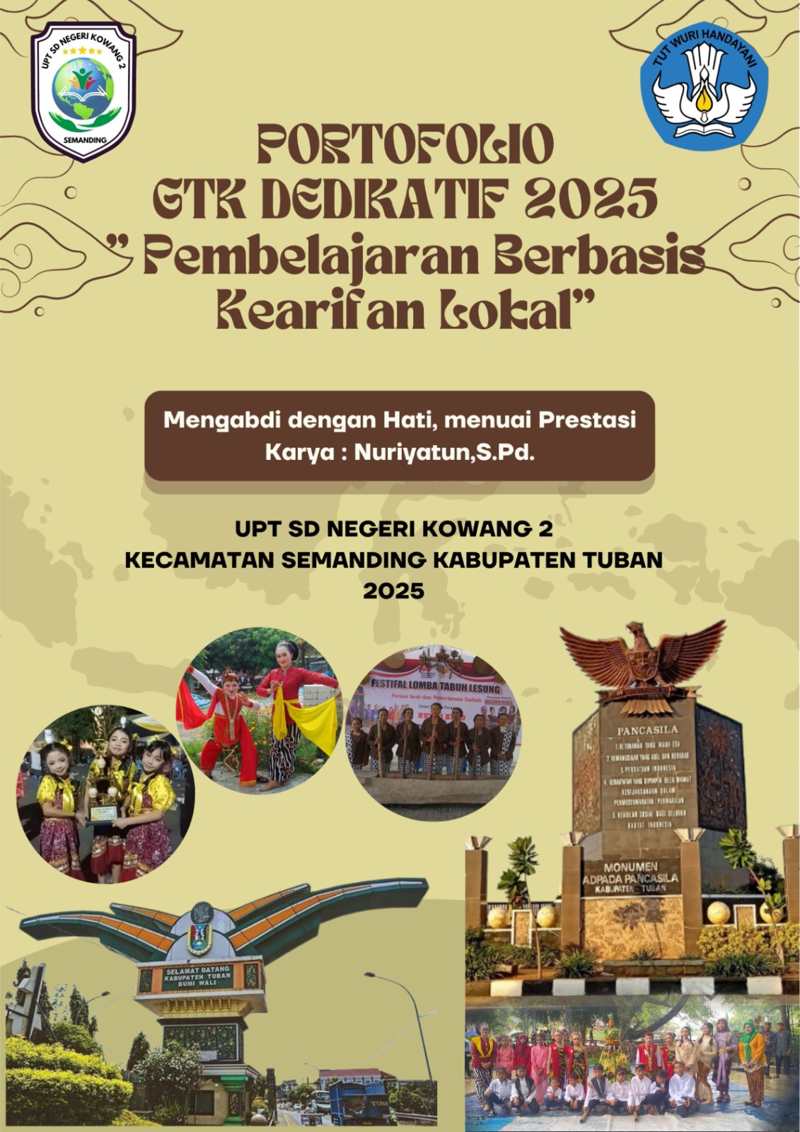 Kata Pengantar Puji syukur ke hadirat Allah SWT atas limpahan rahmat, taufik, dan hidayah-Nya, sehingga karya sederhana berjudul “Mengabdi dengan Hati, Menuai Prestasi” ini dapat tersusun dengan penuh rasa syukur dan cinta. Karya ini lahir dari perjalanan panjang seorang pendidik yang berusaha menanamkan nilai keikhlasan, keteladanan, dan dedikasi dalam dunia pendidikan. Tulisan ini bukan sekadar catatan tentang tugas dan tanggung jawab, melainkan potret hati seorang guru yang terus belajar untuk memberi makna pada setiap langkah pengabdian. Semoga karya ini dapat menginspirasi rekan sejawat, peserta didik, dan siapa pun yang meyakini bahwa mengajar adalah panggilan jiwa, bukan sekadar profesi. Terima kasih kepada semua pihak yang senantiasa memberi dukungan dan doa dalam setiap langkah perjalanan ini. Semoga Allah meridhai setiap upaya kecil yang tulus untuk mencerdaskan kehidupan bangsa. Tuban, 7 Oktober 2025 Nuriyatun, S.Pd PORTOFOLIO GTK DEDIKATIF Data Diri Nama: Nuriyatun NIP: 198305262022212034 No Hp : 085334546822 Alamat: Dusun Janten, Desa Ngino, Kecamatan Semanding, Kabupaten Tuban Lembaga: UPT SD Negeri Kowang 2 1.Profil dan Pengalaman Mengajar Saya, Nuriyatun, memulai perjalanan sebagai pendidik pada tahun 2001, setelah menamatkan pendidikan di MAN Nglawak Kertosono, Nganjuk. Pada waktu itu, di Desa Ngino sangat sulit menemukan tenaga pendidik dengan latar belakang pendidikan menengah. Dalam kegiatan KKN mahasiswa UNIROW tahun 2001, saya turut membantu mendirikan TK Tunas Harapan Ngino. Karena keterbatasan sumber daya manusia — sebagian besar masyarakat hanya lulusan sekolah dasar — kepala desa saat itu meminta saya untuk membantu mengajar di TK tersebut. Dari sanalah langkah awal saya sebagai pendidik dimulai. Pada tahun 2005, saya berpindah mengajar di SDN Ngino 1. Tahun 2010, di sore hari saya dipercaya mengajar di SMK Atab Kecamatan Grabagan, dan malam harinya aktif mengajar program Keaksaraan Fungsional bagi masyarakat desa yang belum mengenal baca tulis. Tidak berhenti di situ, pada tahun 2011, saya mendirikan lembaga PAUD yang hingga kini masih berjalan dan terus berkembang menjadi tempat belajar anak-anak usia dini di sekitar Ngino. Tahun 2016, saya berpindah tugas ke SMP Negeri 1 Plumpang sebagai guru Seni Budaya, sesuai dengan latar belakang pendidikan saya S1 Seni Tari. Selain mengajar, saya juga mendirikan Taman Baca Masyarakat di kawasan Sendang Asmoro, yang menjadi wadah literasi bagi anak-anak dan warga sekitar. Pada tahun 2022, saya resmi diangkat sebagai guru ASN P3K dan bertugas di UPT SD Negeri Kowang 2 hingga sekarang. a.Kiprah dan Dedikasi di Dunia Pendidikan Perjalanan saya di dunia pendidikan tidak selalu mudah. Desa Ngino dulunya dikenal sebagai daerah pinggiran hutan dengan tingkat pendidikan masyarakat yang masih rendah. Ada mitos adat lama yang menyebar luas di masyarakat: > “Untuk apa sekolah tinggi-tinggi? Akhirnya juga akan kembali ke sawah.” Namun, keyakinan saya bahwa pendidikan mampu mengubah nasib dan peradaban mendorong saya untuk terus berjuang. Saya ingin menjadi figur publik pendidikan di desa sendiri — membuktikan bahwa anak desa pun bisa maju dan berdaya. Kini, berkat semangat bersama dan kerja keras banyak pihak, banyak anak dari Desa Ngino yang telah menempuh pendidikan tinggi hingga sarjana (S1). b. Peran Sosial dan Budaya Selain menjadi pendidik, saya juga aktif sebagai pembina ekstrakurikuler seni tari di sekolah. Melalui kegiatan ini, saya berupaya melestarikan nilai-nilai budaya lokal agar tetap hidup di kalangan generasi muda. Saya juga dikenal sebagai penggiat budaya daerah, terutama dalam pelestarian tradisi Keleman, Kupat Sapi, dan Tabuh Lesung, yang menjadi identitas khas Desa Ngino. Di luar sekolah, saya aktif dalam berbagai organisasi masyarakat, yang fokus pada kegiatan keagamaan, sosial, dan budaya, termasuk di Taman Pendidikan Al-Qur’an (TPA). Bagi saya, pendidikan tidak hanya berlangsung di ruang kelas, tetapi juga di tengah-tengah kehidupan masyarakat. Dengan melibatkan semua elemen, kita dapat menumbuhkan karakter, memperkuat spiritualitas, serta menjaga warisan budaya agar tetap lestari. 2.Latar Belakang Dedikasi Perjalanan saya di dunia pendidikan bukanlah jalan yang lurus dan mudah. Selama 21 tahun saya mengabdi sebagai guru GTT, dengan segala keterbatasan dan ketidakpastian. Pada masa itu, kebijakan pemerintah tengah memberlakukan moratorium penerimaan PNS, sehingga tidak ada kesempatan untuk diangkat menjadi pegawai negeri. Saya tetap bertahan dengan gaji Rp50.000 per bulan, jumlah yang bahkan tidak cukup untuk memenuhi kebutuhan dasar keluarga. Tidak jarang, hati ini bergejolak antara bertahan dan menyerah. Ada masa ketika saya berpikir untuk meninggalkan profesi guru, mencari pekerjaan lain yang lebih menjanjikan secara materi. Namun, jiwa pendidik tidak pernah benar-benar bisa berhenti mengajar. Ada rasa tanggung jawab moral yang besar untuk terus menyalakan lentera ilmu bagi anak-anak di desa, walau dalam keadaan apa pun. Saya belajar bahwa menjadi guru bukan sekadar profesi, melainkan panggilan jiwa. Di tengah keterbatasan, saya tetap berusaha memberi yang terbaik. Waktu berjalan, dan akhirnya datang kebijakan baru penerimaan ASN P3K, yang menjadi angin segar bagi para pejuang pendidikan seperti saya. Semangat yang sempat meredup kembali menyala. Saya pun diterima sebagai guru ASN P3K di UPT SD Negeri Kowang 2, tempat di mana langkah dedikasi saya berlanjut hingga kini. Ketika pertama kali mengajar di SDN Kowang 2, saya mendapati bahwa anak-anak belum pernah mengikuti ajang lomba kesenian seperti tari, puisi, menyanyi, maupun pantomim. Dari situlah saya mulai membangun semangat baru. Perlahan namun pasti, anak-anak mulai berani tampil dan mengekspresikan diri. Kini, tari Gambyong dan tari Remo telah menjadi bagian dari kegiatan rutin sekolah. Anak-anak pun sering mendapat undangan tampil di berbagai acara masyarakat maupun instansi. Dalam ajang Student Week tingkat Kabupaten Tuban, mereka ber